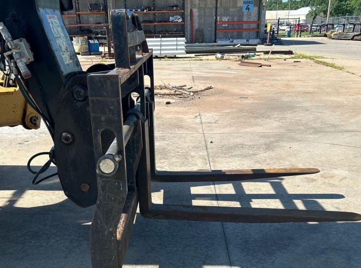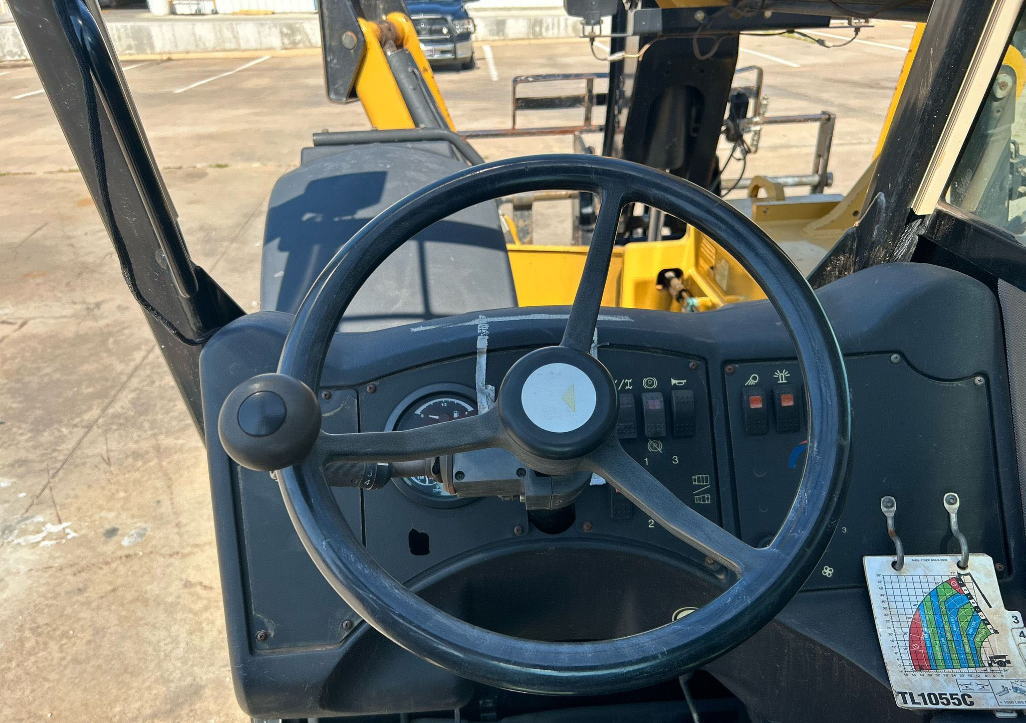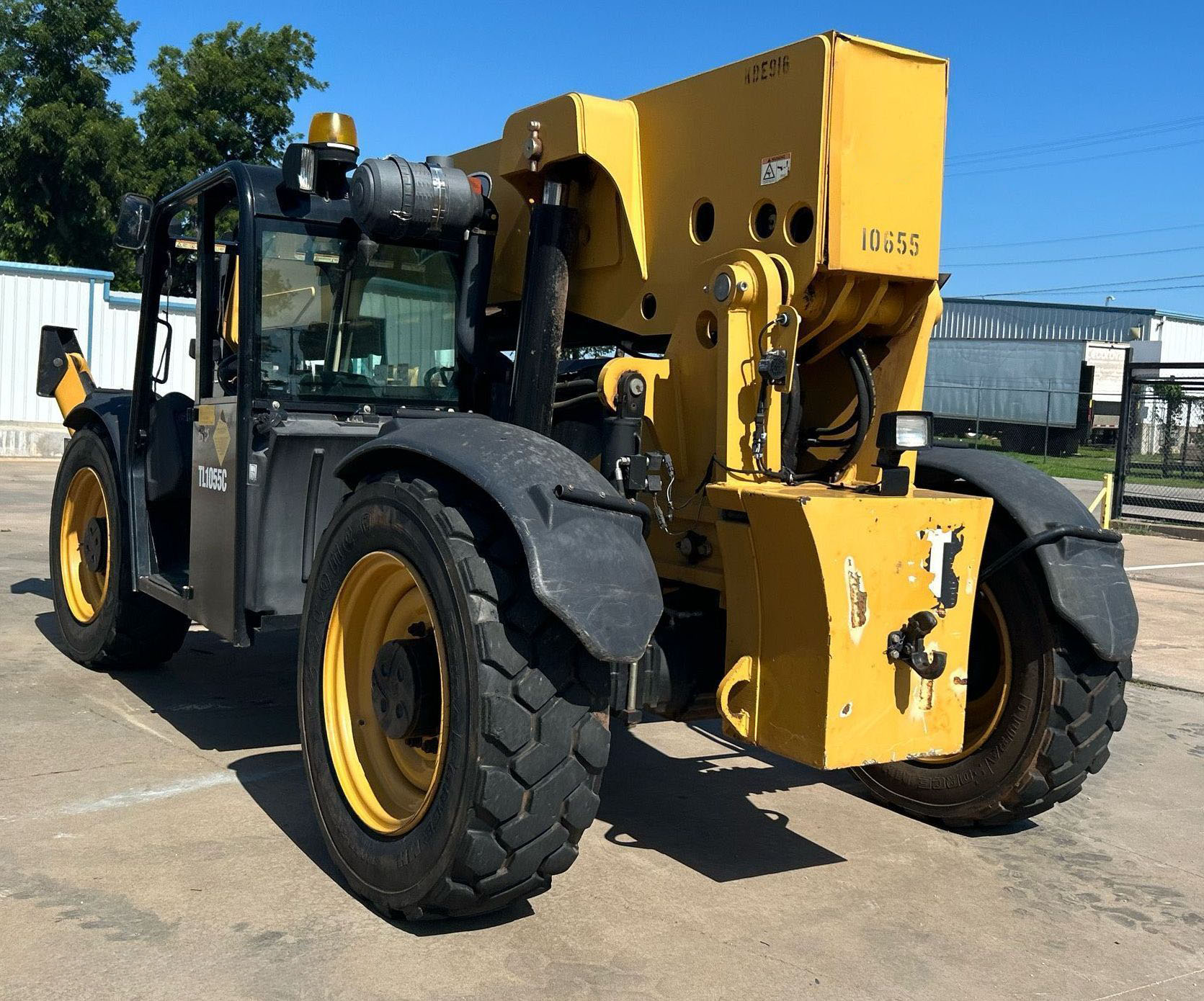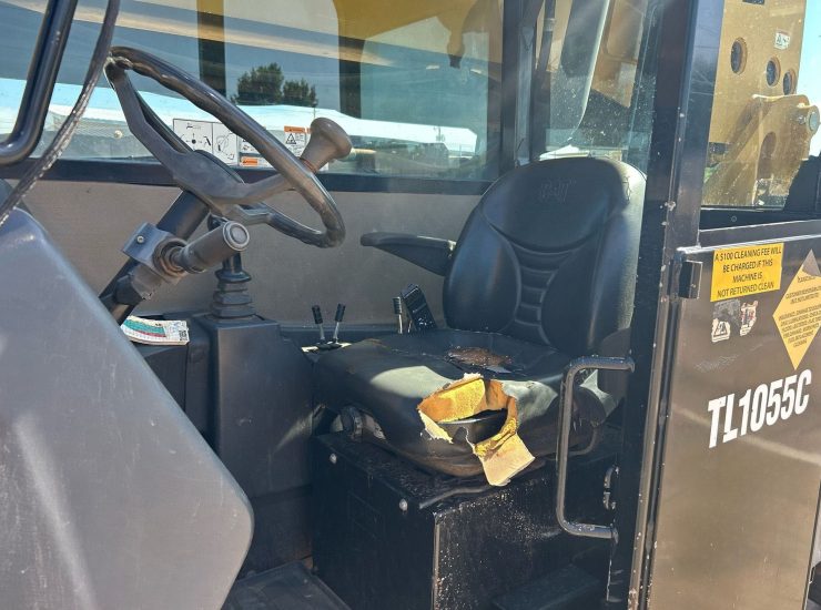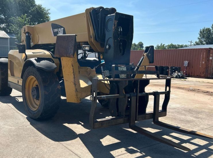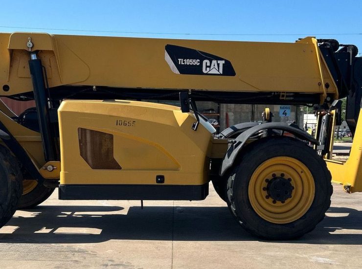 The 2013 Caterpillar TL1055C telehandler has 3,344 hours and is powered by a 4.4L Caterpillar C4.4 Acert diesel engine. It features a Powershift transmission with 4 forward and 4 reverse speeds, crab and four-wheel steering. The telehandler has a maximum lift capacity of 10,000 lbs and a lift height of 56', with a 4-stage boom. It includes 48" forks, auxiliary hydraulics, and hydraulic outriggers. The machine is equipped with solid 400.75-28 tires and an OROPS canopy.