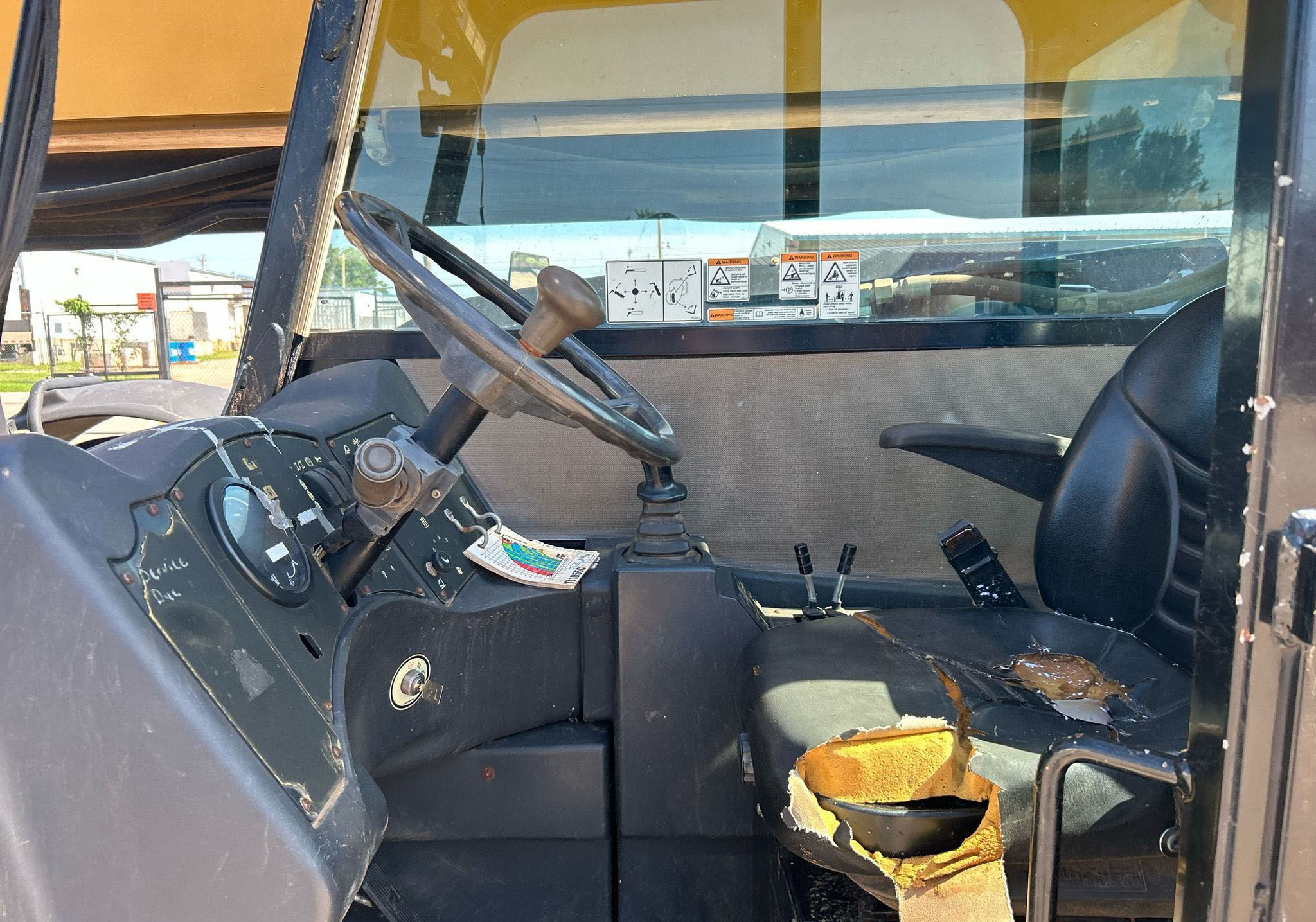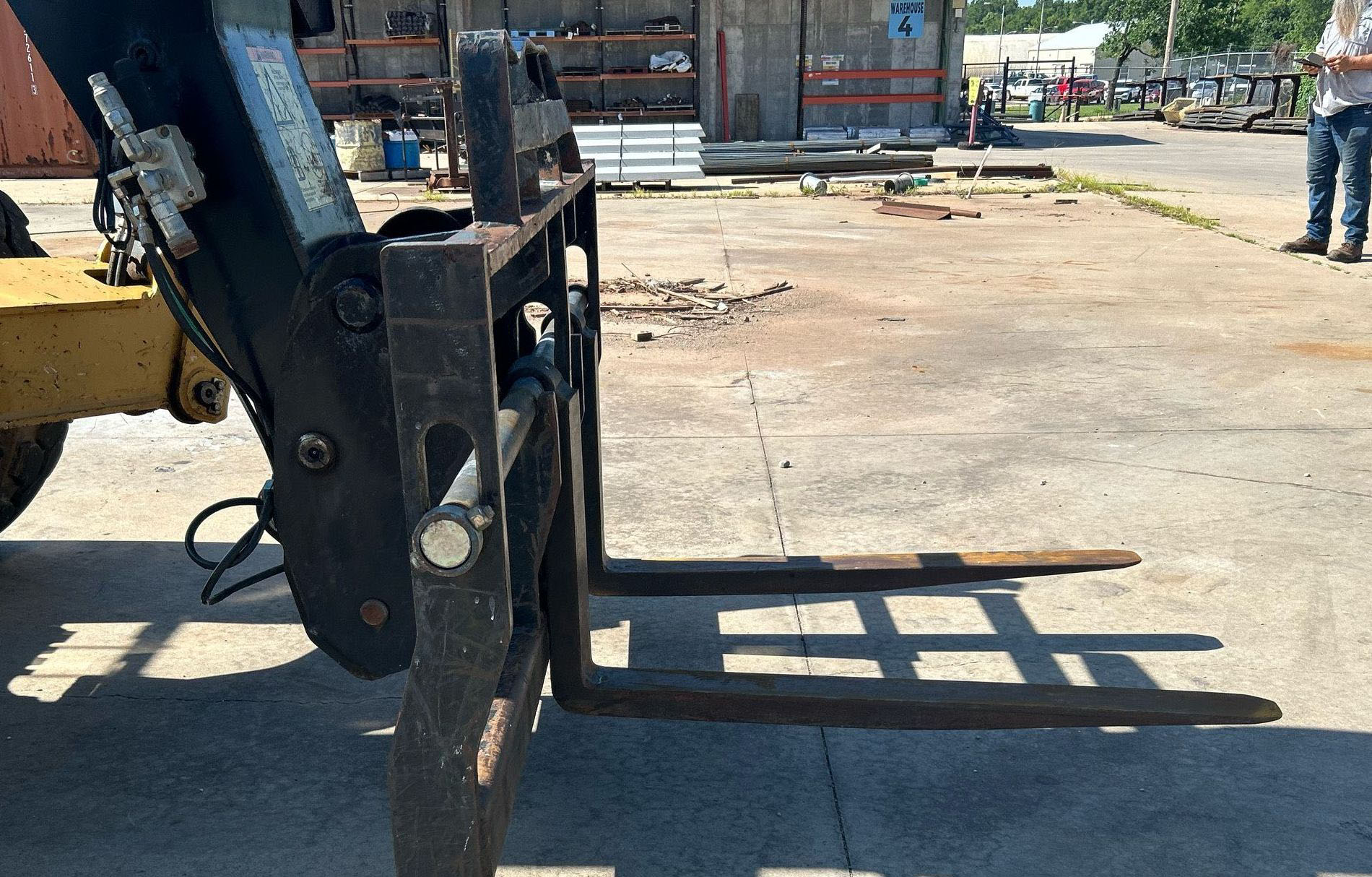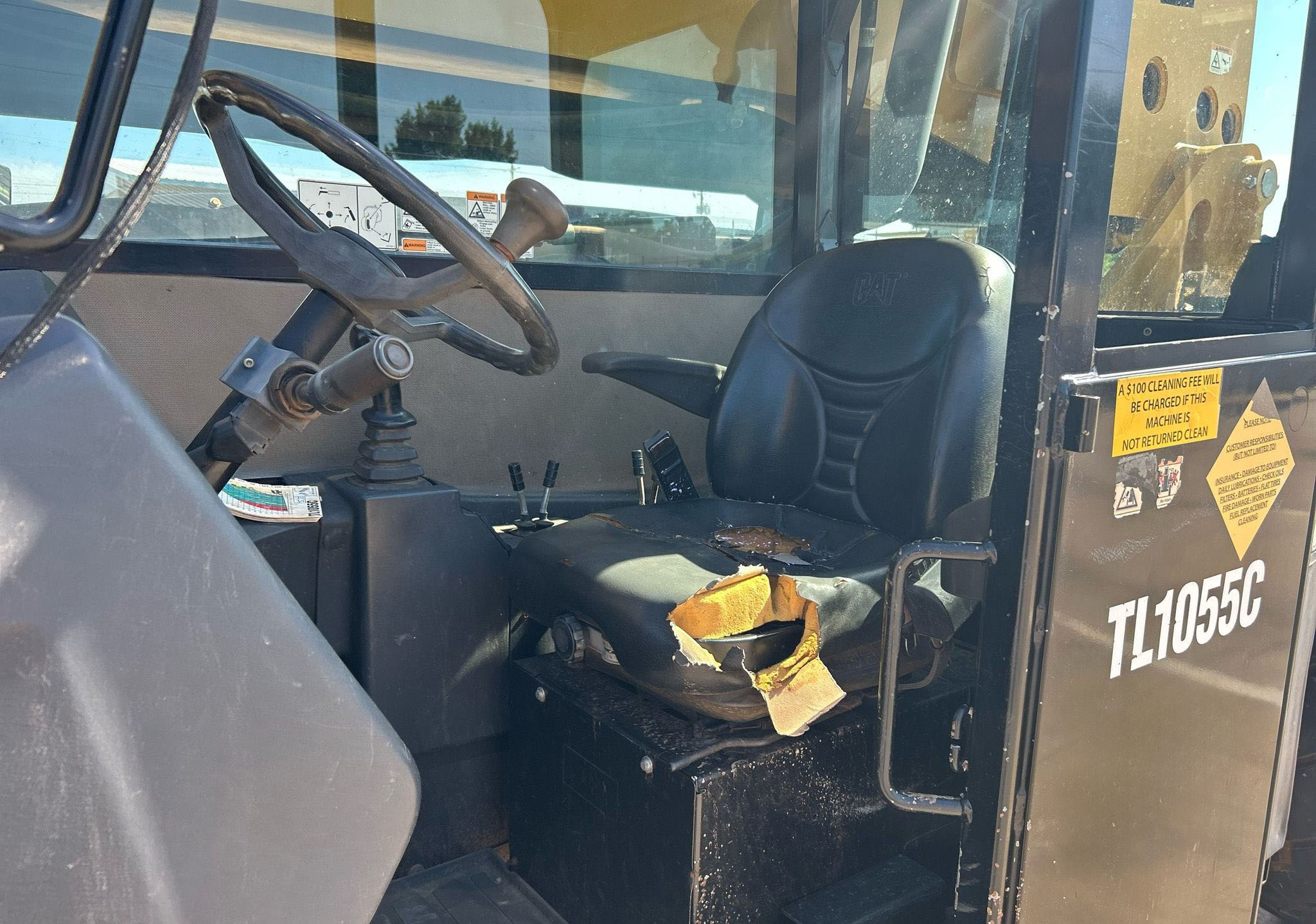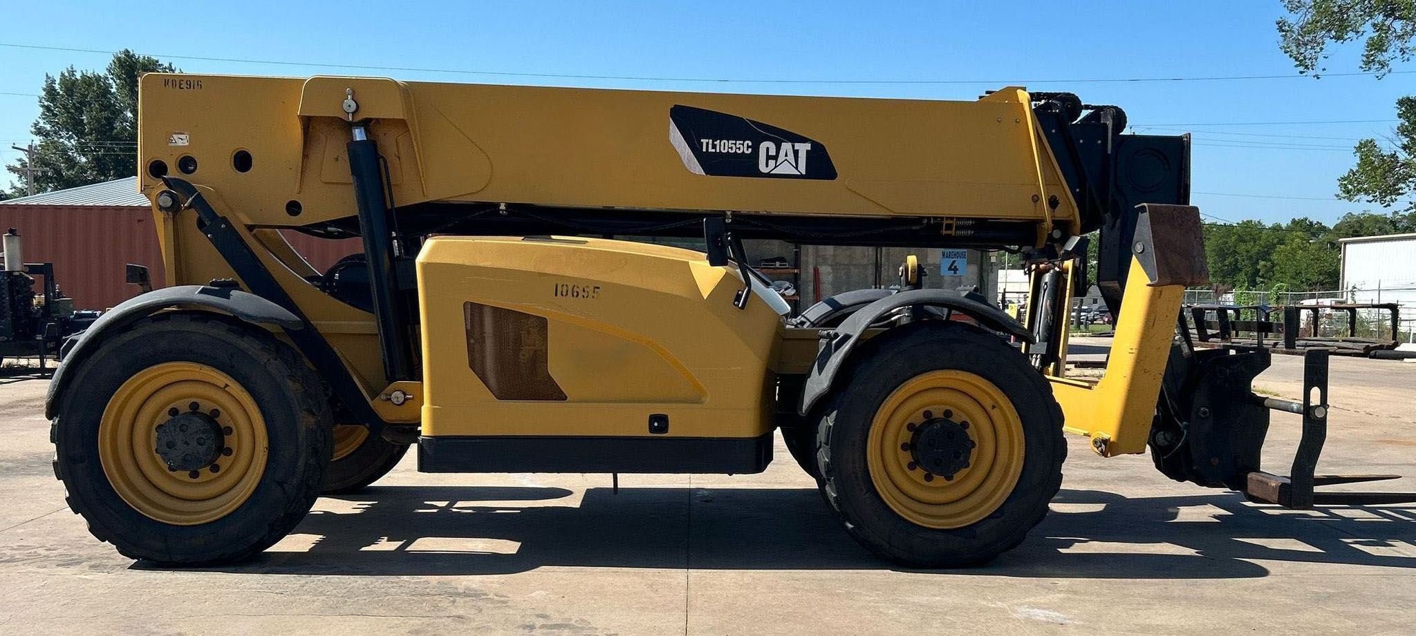 The 2013 Caterpillar TL1055C telehandler has 3,344 hours and is powered by a 4.4L Caterpillar C4.4 Acert diesel engine. It features a Powershift transmission with 4 forward and 4 reverse speeds, crab and four-wheel steering. The telehandler has a maximum lift capacity of 10,000 lbs and a lift height of 56', with a 4-stage boom. It includes 48" forks, auxiliary hydraulics, and hydraulic outriggers. The machine is equipped with solid 400.75-28 tires and an OROPS canopy.