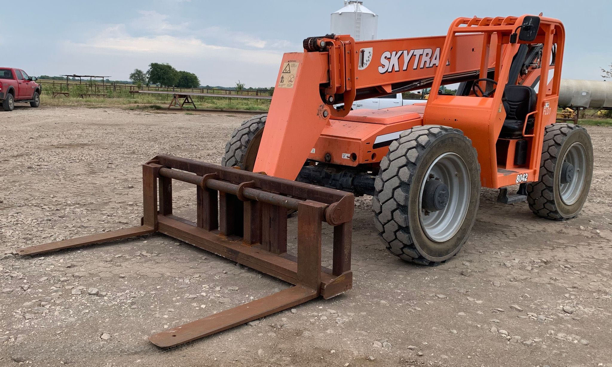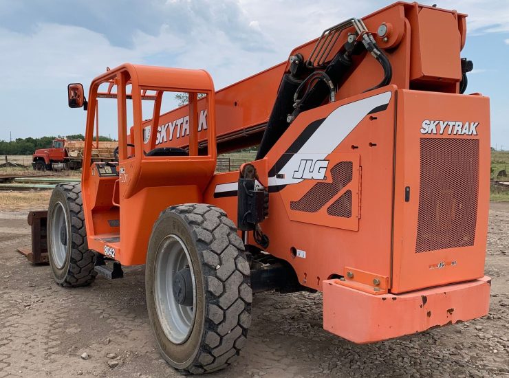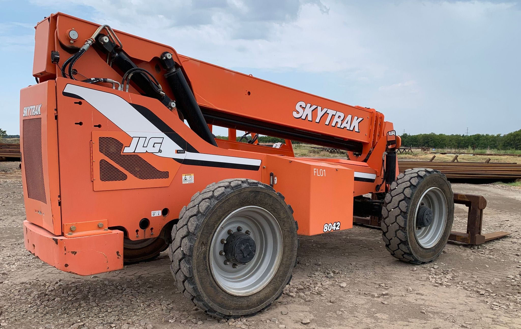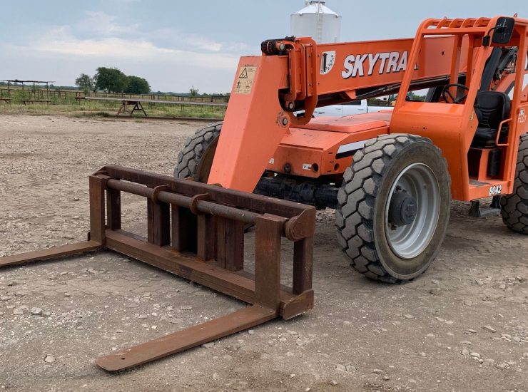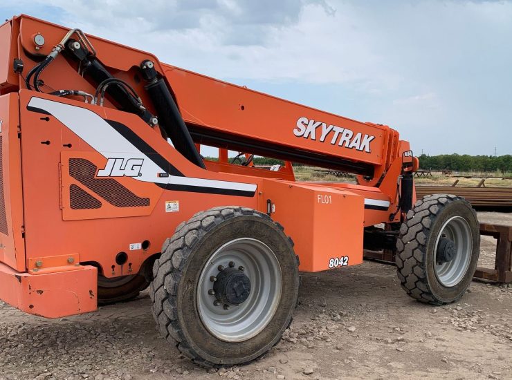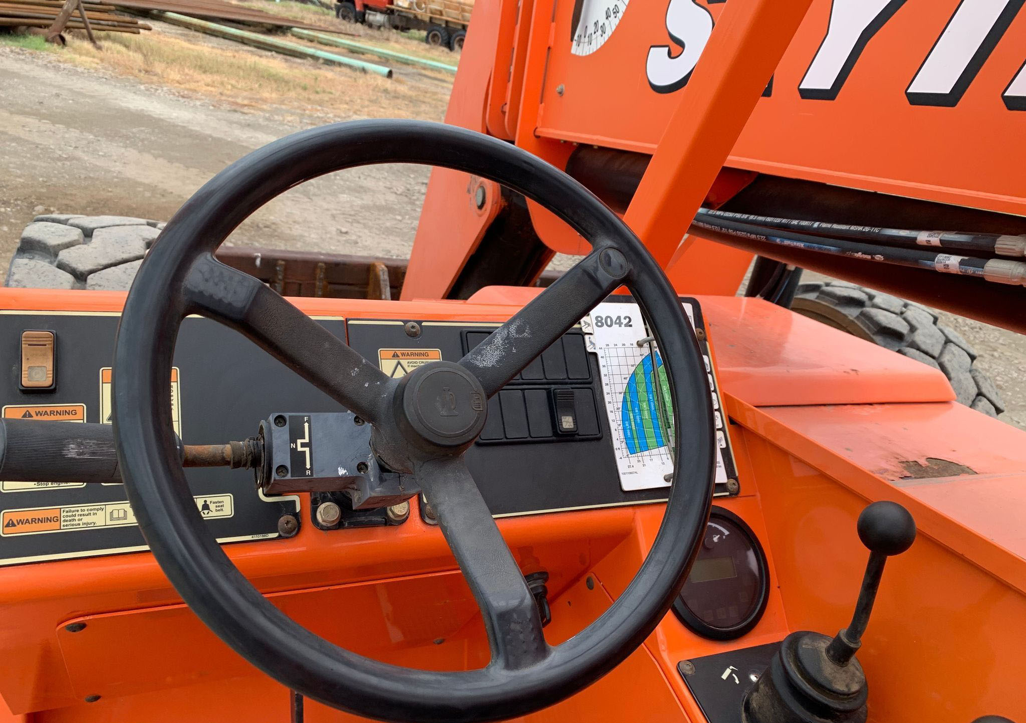 The 2014 JLG 8042 telehandler has 871 hours and is powered by a 3.261L Cummins QSB3.3 diesel engine with a Powershift transmission (4 forward, 4 reverse) and four-wheel drive. It features a canopy, crab and four-wheel steering, and a maximum lift capacity of 8,000 lbs with a 42' lift height and 3-stage boom. The telehandler includes 48" forks, auxiliary hydraulics, a tilt carriage, hydraulic leveling, and a manual quick attach. It is equipped with foam-filled 370/75-28 tires and an 8,000 lbs counterweight.