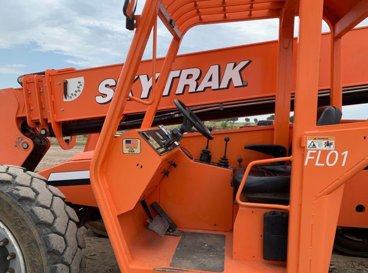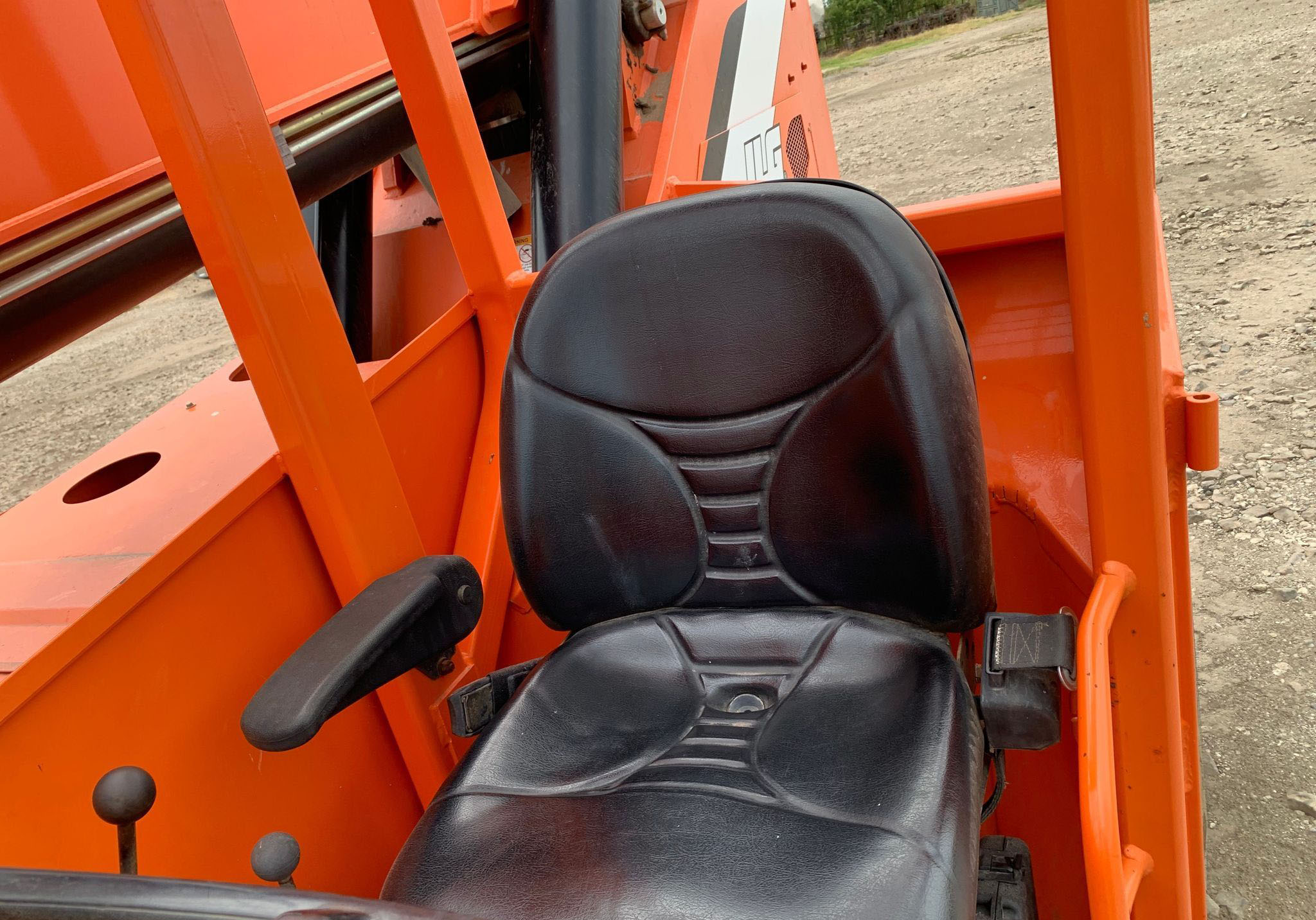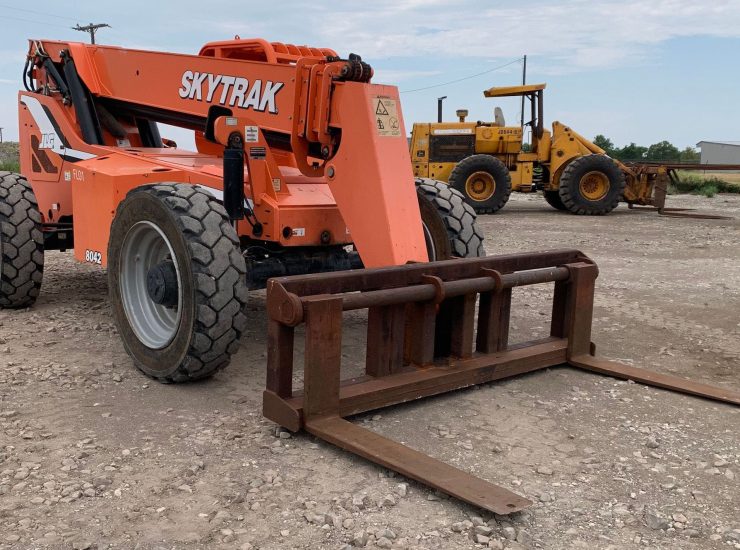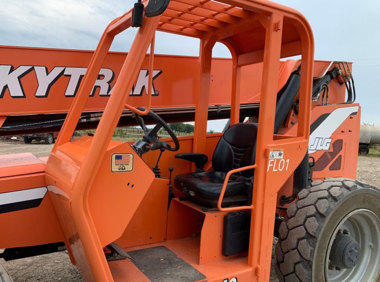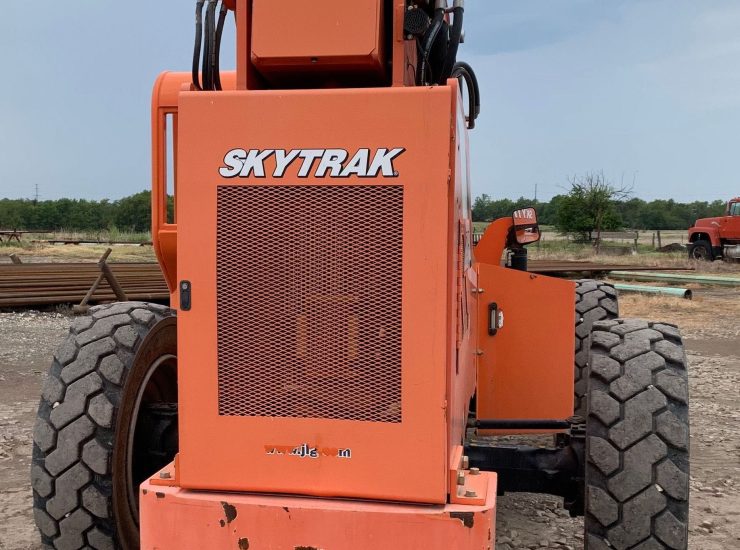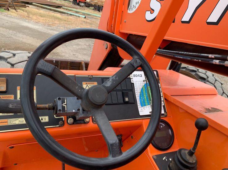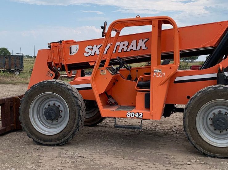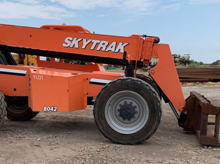 The 2014 JLG 8042 telehandler has 871 hours and is powered by a 3.261L Cummins QSB3.3 diesel engine with a Powershift transmission (4 forward, 4 reverse) and four-wheel drive. It features a canopy, crab and four-wheel steering, and a maximum lift capacity of 8,000 lbs with a 42' lift height and 3-stage boom. The telehandler includes 48" forks, auxiliary hydraulics, a tilt carriage, hydraulic leveling, and a manual quick attach. It is equipped with foam-filled 370/75-28 tires and an 8,000 lbs counterweight.