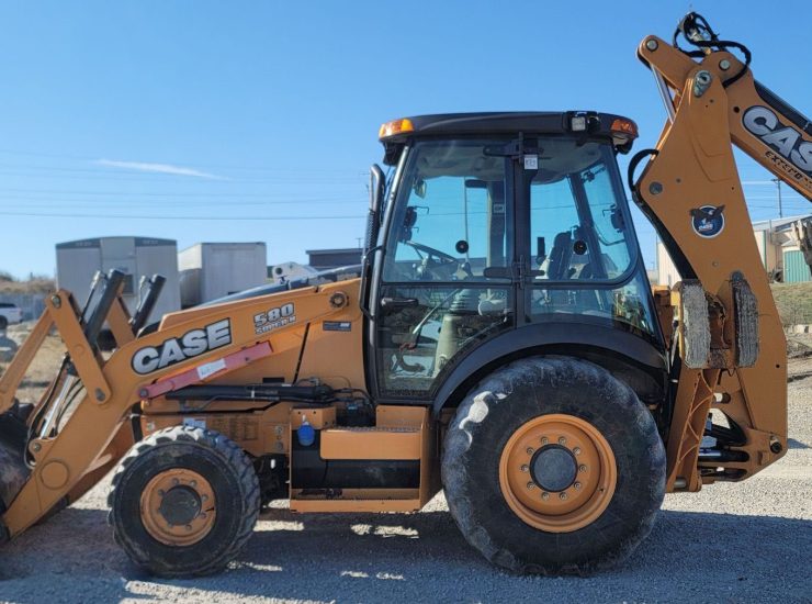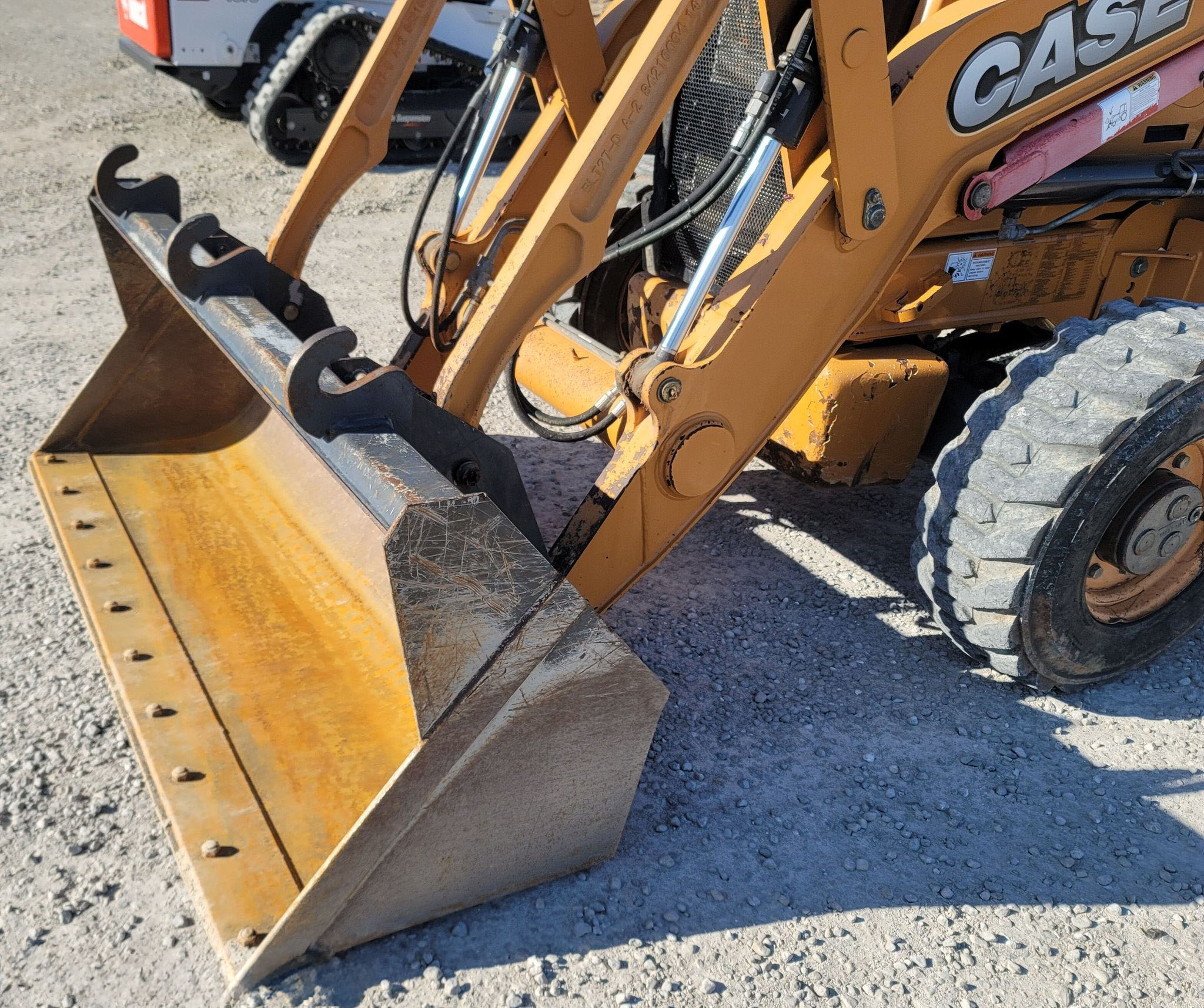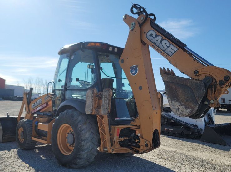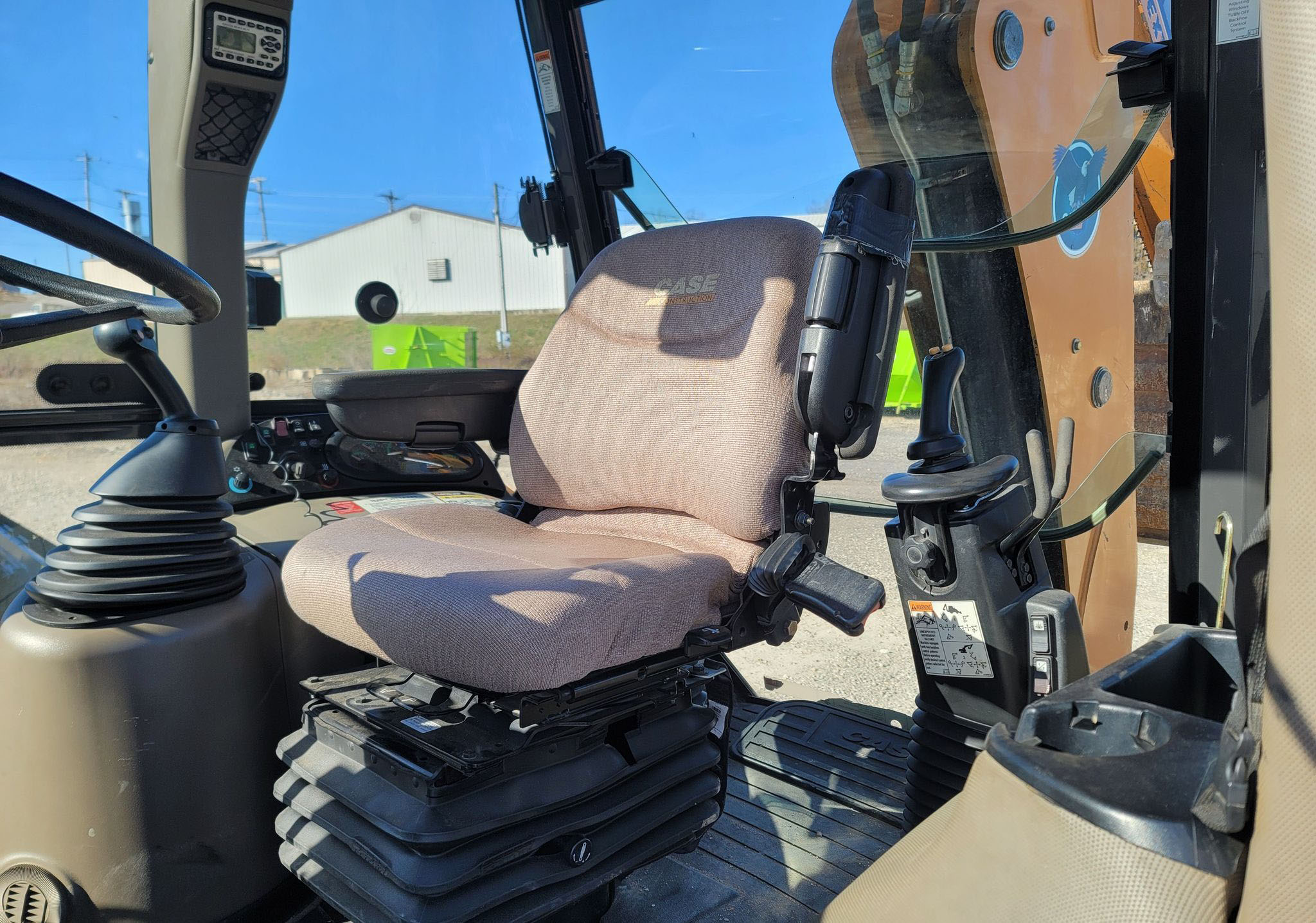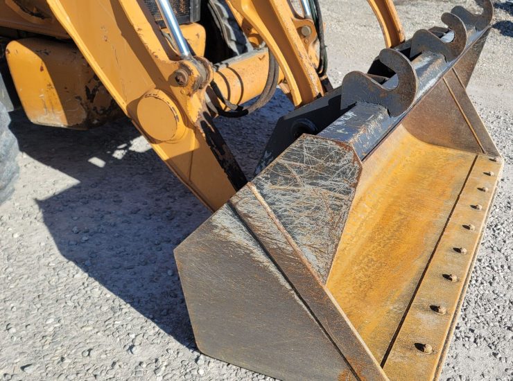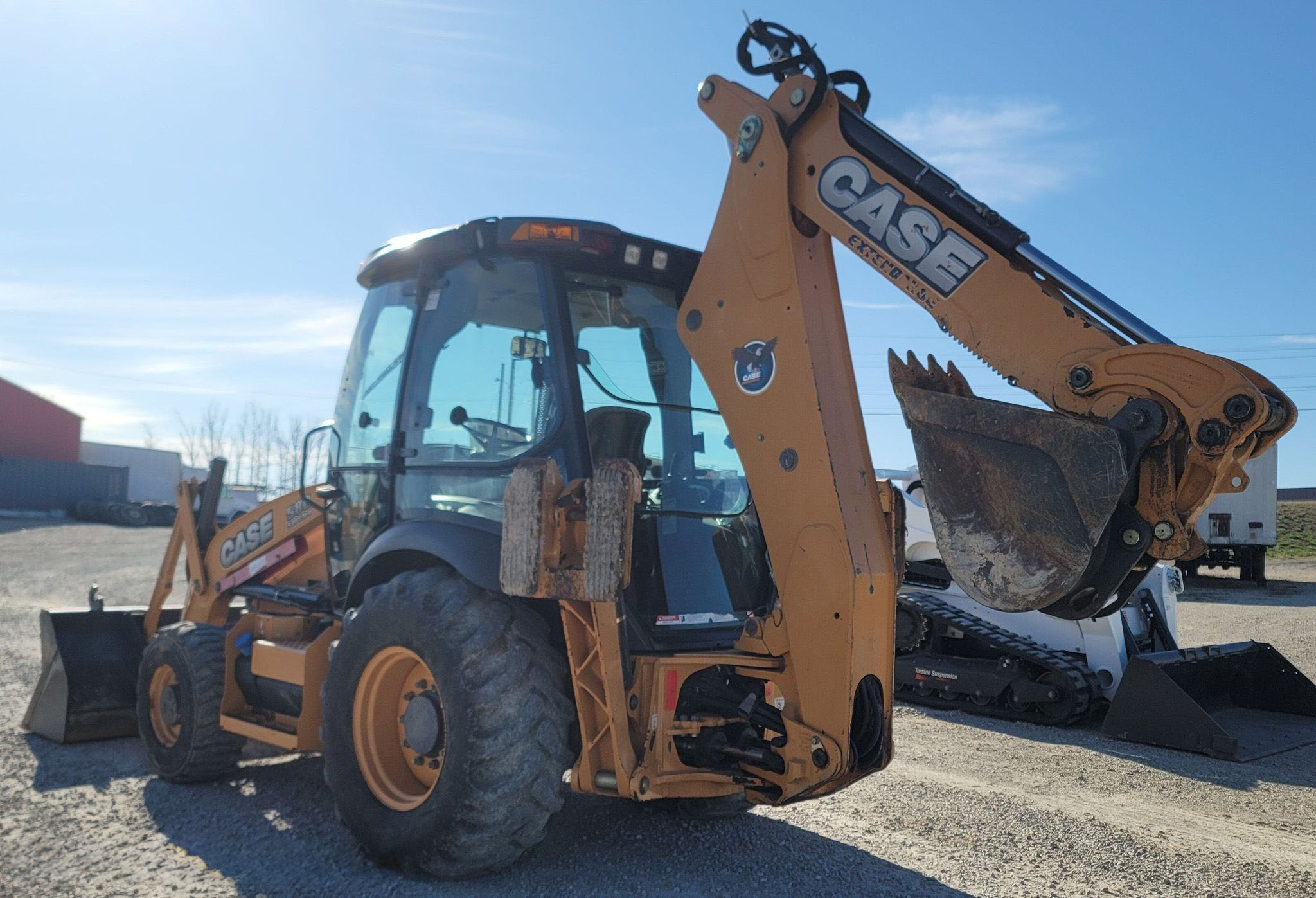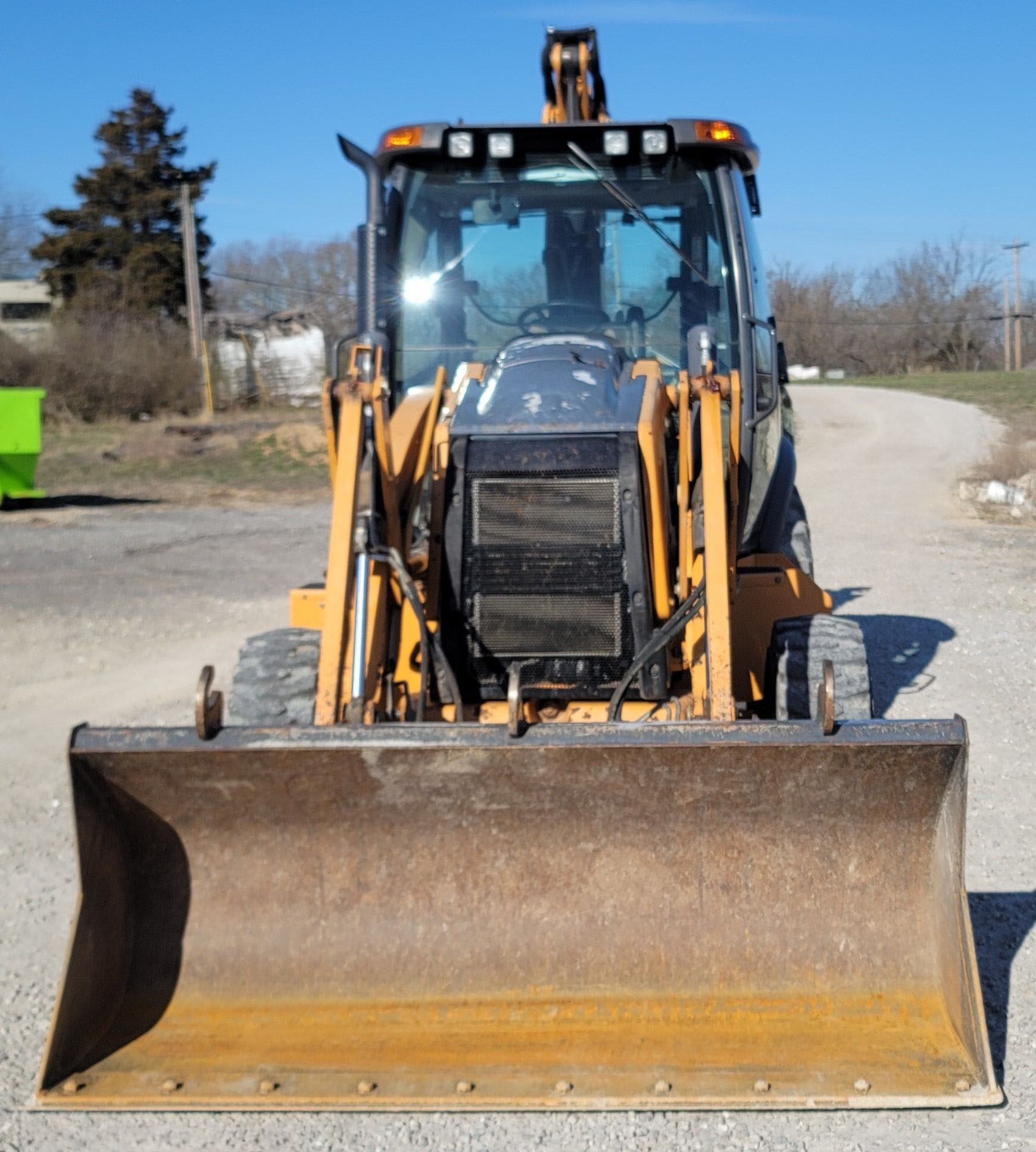 The 2015 Case 580 Super N backhoe has 1,136 hours and features a 4-cylinder diesel engine. It has a shuttle shift transmission with 4 forward and 4 reverse speeds, and includes a differential lock. The operator’s station is equipped with an EROPS cabin with AC and heat, and the backhoe controls are Wobble stick / two stick. The loader has an 82" bucket with a weld-on cutting edge, while the backhoe features an extendable stick with a 16" bucket. The machine is fitted with 12-16.5 front tires and 19.5-24 rear tires.