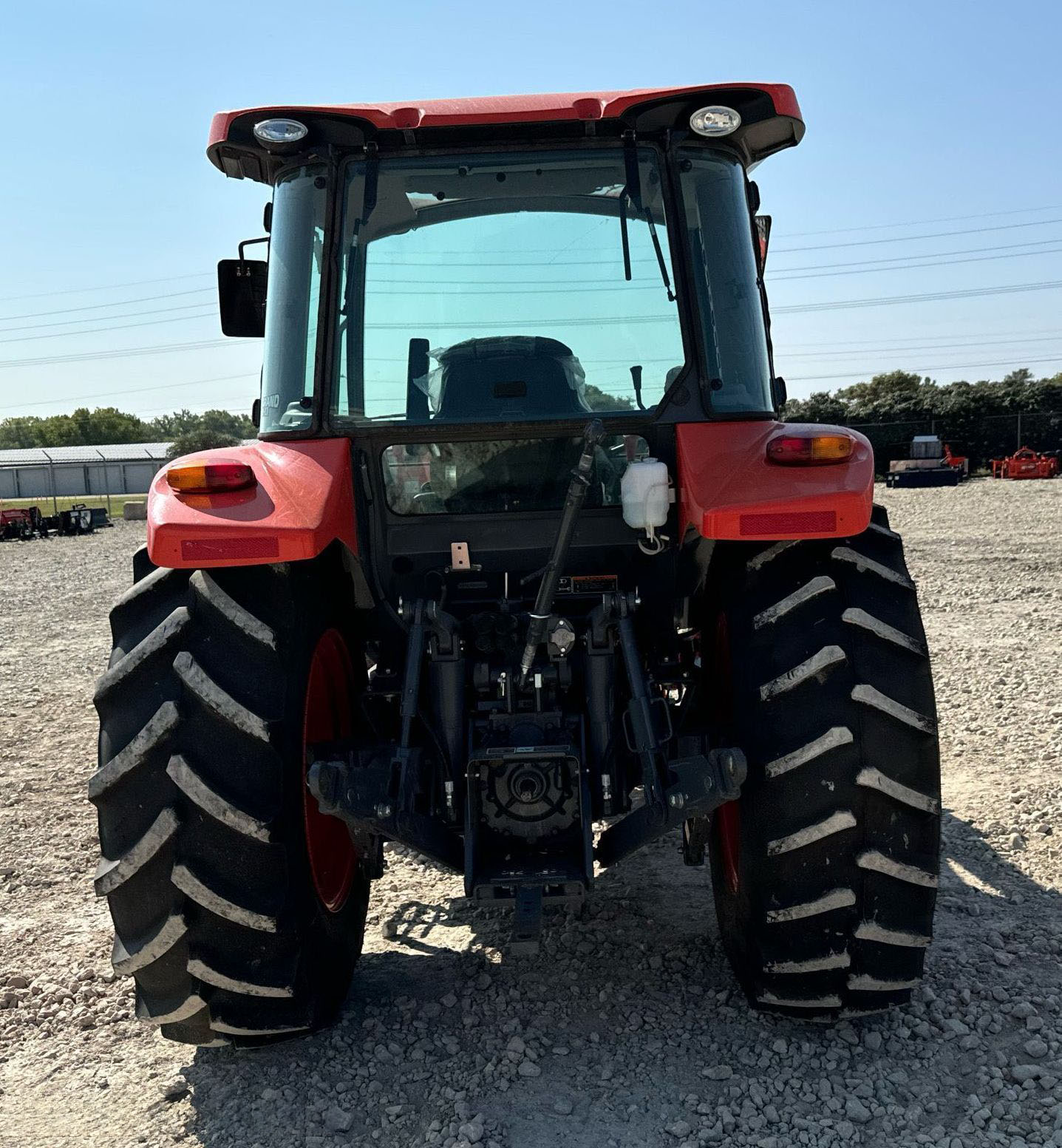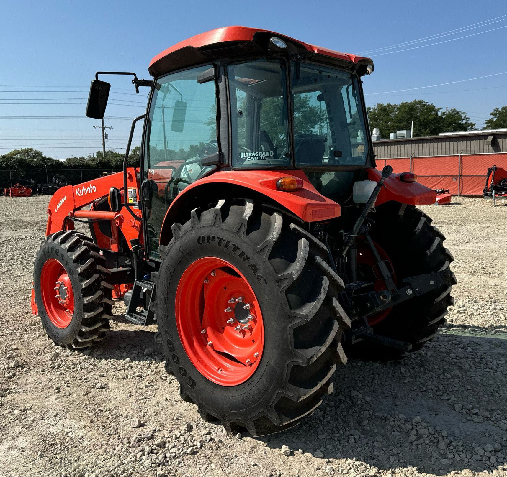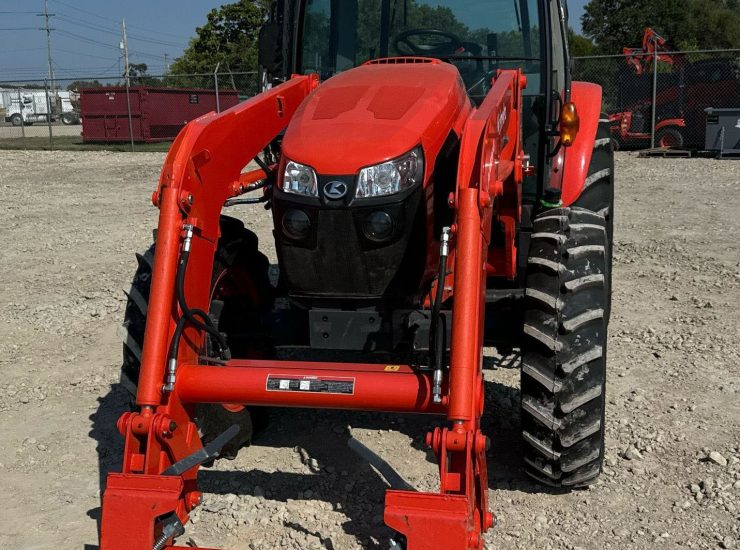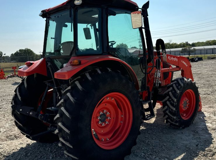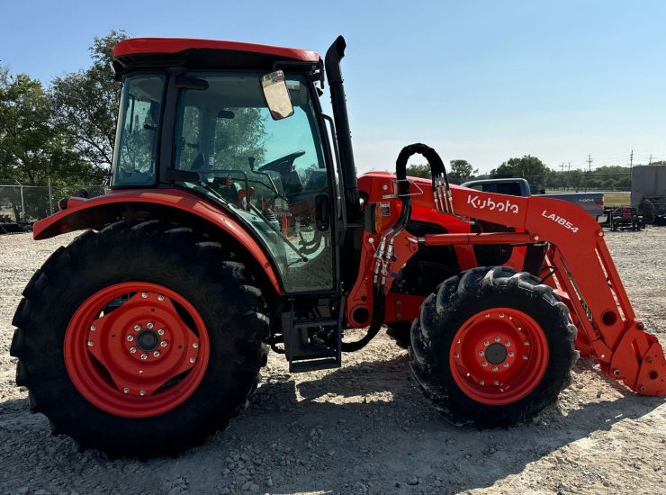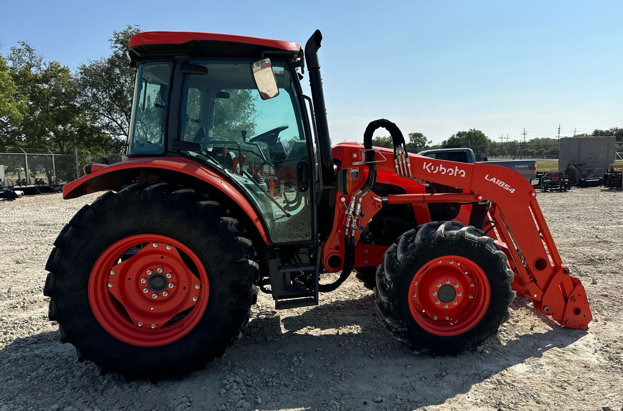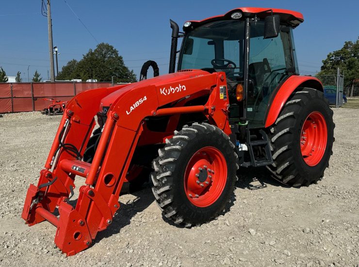 The 2021 Kubota M5-091D MFWD tractor has 202 hours and is powered by a 3.8L Kubota V3800 diesel engine with 92.5 HP and a synchro transmission (8F-8R) with left-hand reverser and differential lock. It features an enclosed cab with AC and heat. The tractor is equipped with a 540 PTO, three-point hitch with top link, seven-pin outlet, and two hydraulic remote sets. It includes a Kubota LA1854 loader with quick attach and joystick controls. The tractor is fitted with 12.4-24 front tires and 18.4-30 rear tires.
