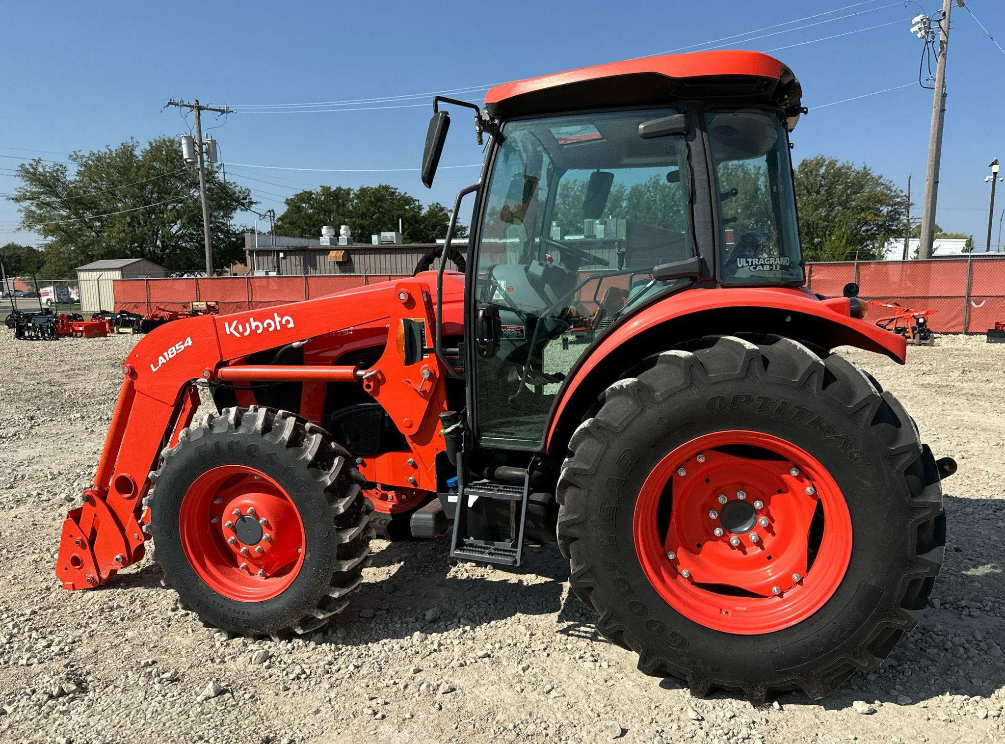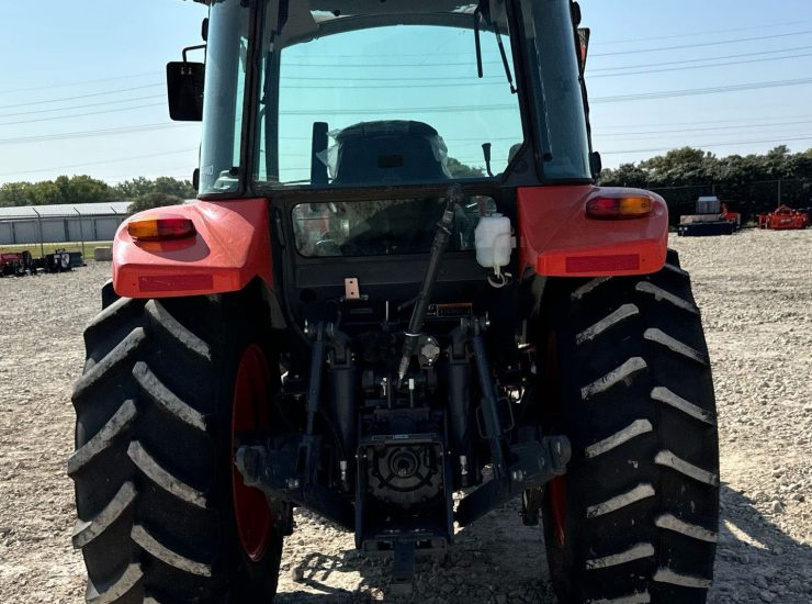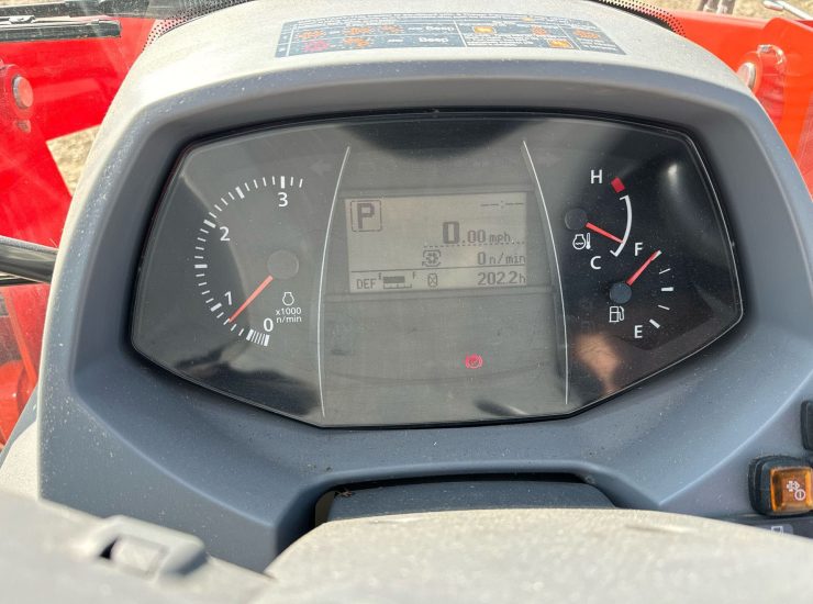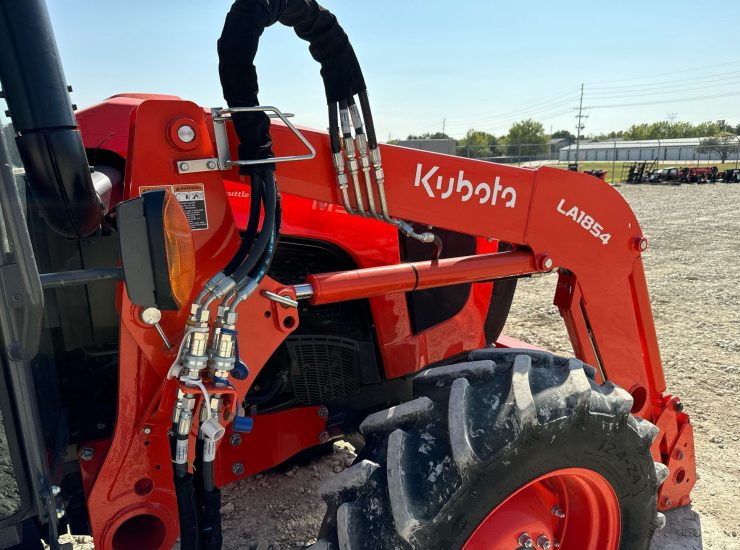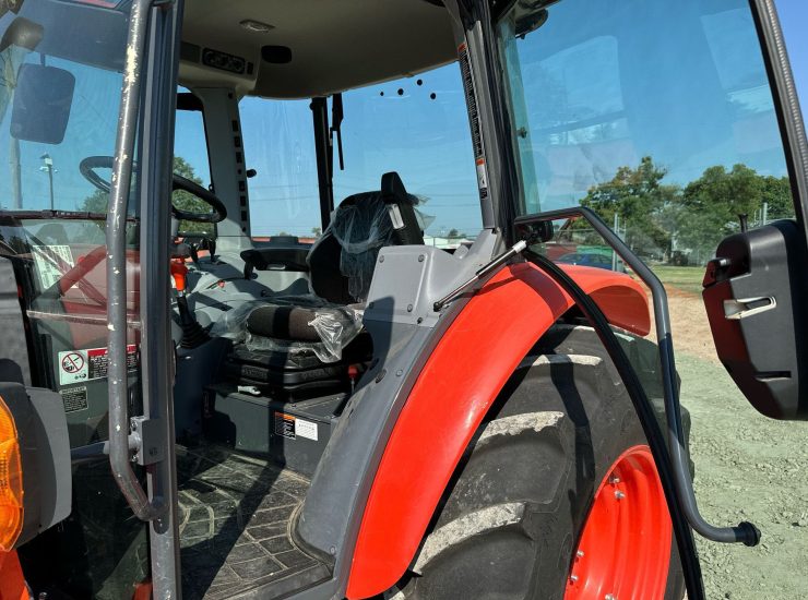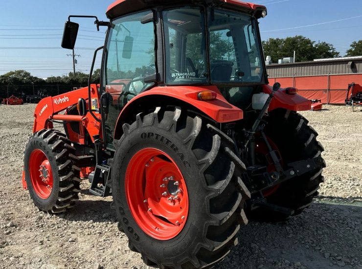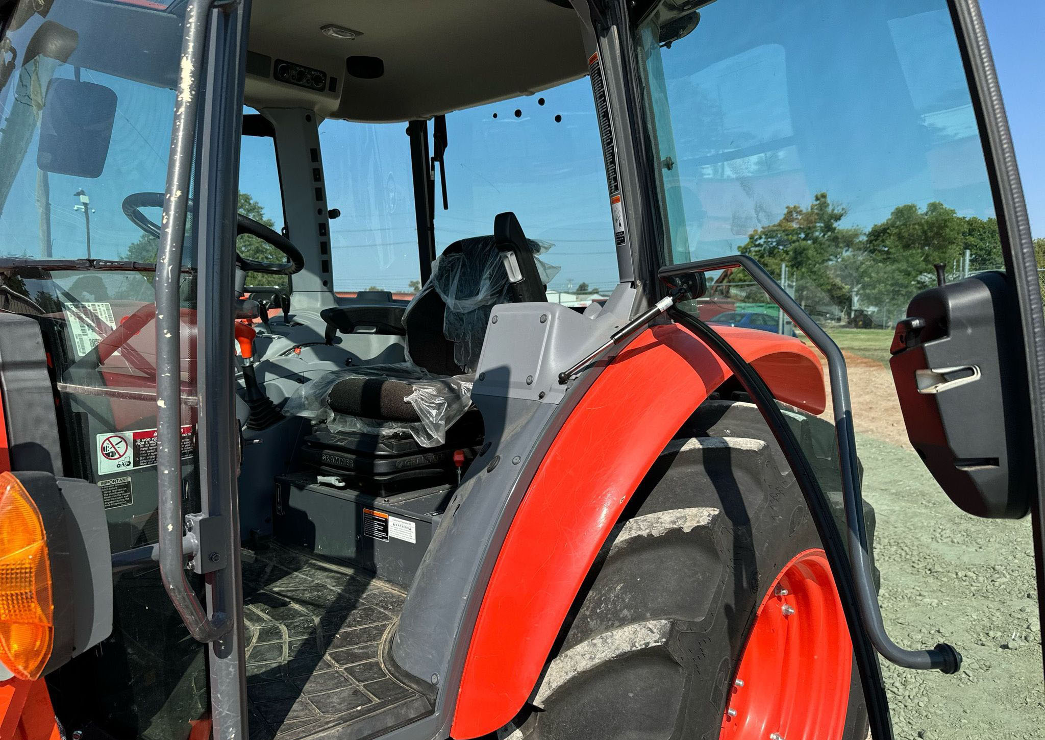 The 2021 Kubota M5-091D MFWD tractor has 202 hours and is powered by a 3.8L Kubota V3800 diesel engine with 92.5 HP and a synchro transmission (8F-8R) with left-hand reverser and differential lock. It features an enclosed cab with AC and heat. The tractor is equipped with a 540 PTO, three-point hitch with top link, seven-pin outlet, and two hydraulic remote sets. It includes a Kubota LA1854 loader with quick attach and joystick controls. The tractor is fitted with 12.4-24 front tires and 18.4-30 rear tires.