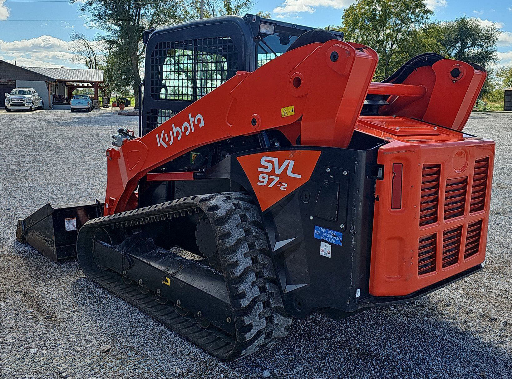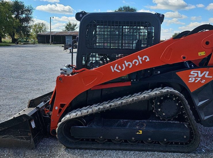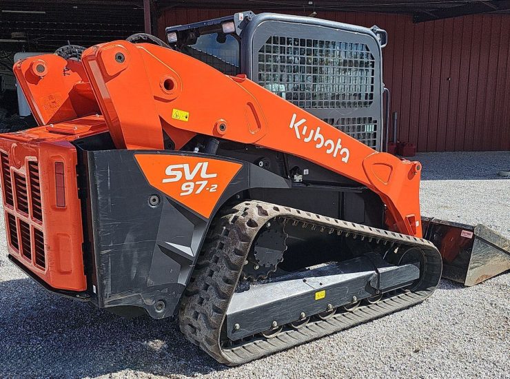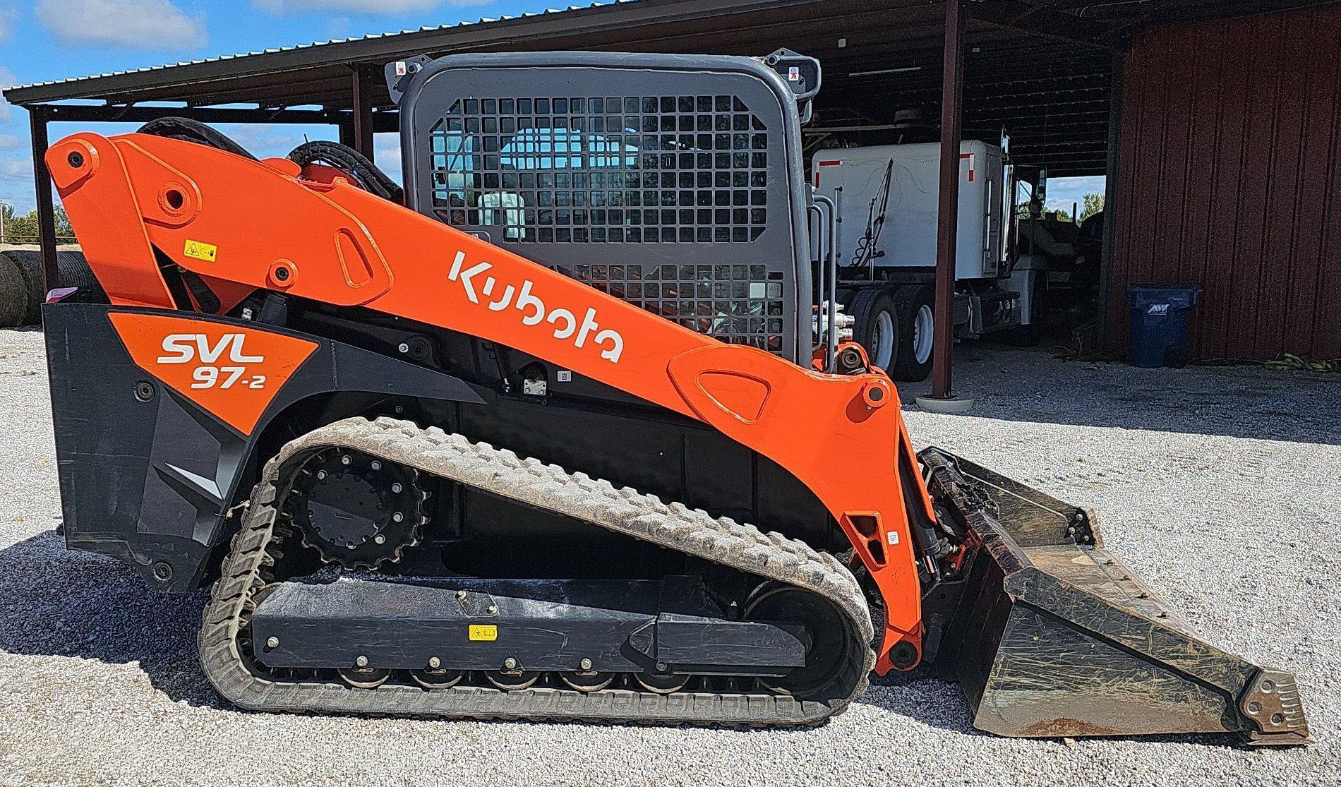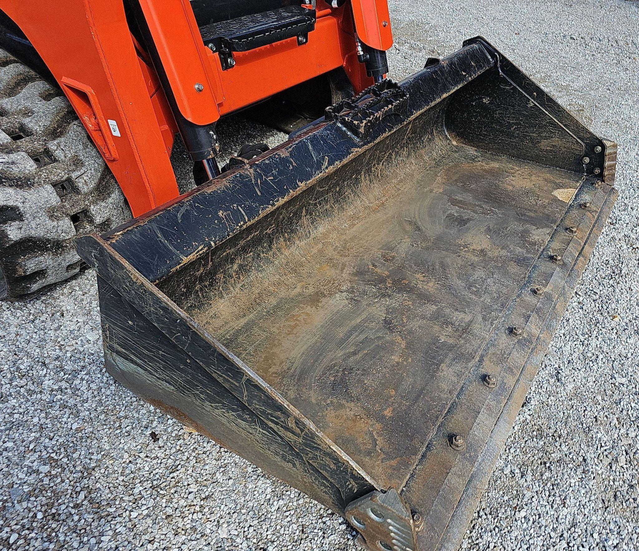The 2021 Kubota SVL97-2 skid steer loader has 204 hours and is powered by a 3.8L Kubota diesel engine with a hydrostatic transmission. It features an enclosed cab with AC and heat, and hand-controlled bucket operation. The loader includes auxiliary hydraulics with high flow, an auxiliary electrical outlet, and a hydraulic quick coupler. It has an 80" low-profile AP-HD80LLC bucket with a bolt-on cutting edge. The machine is equipped with 18" Bridgestone tracks.
