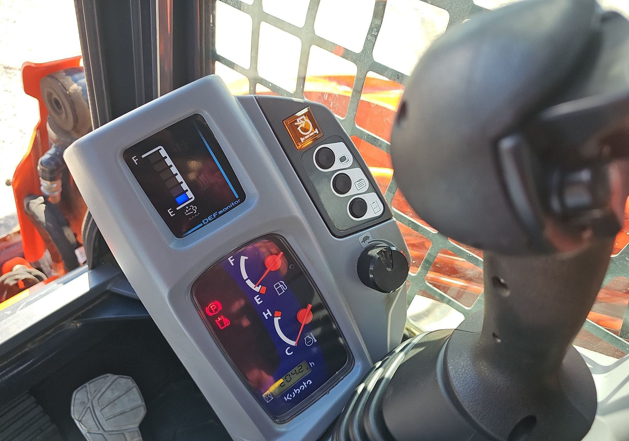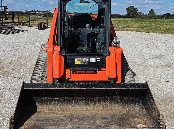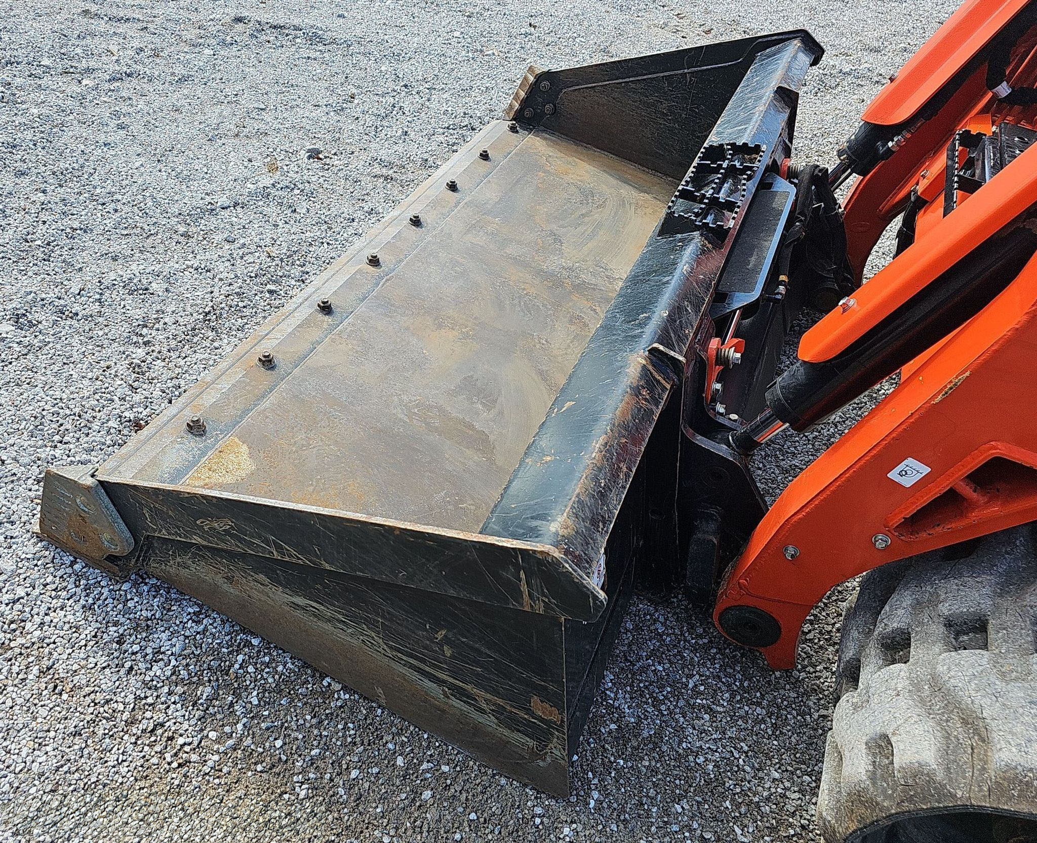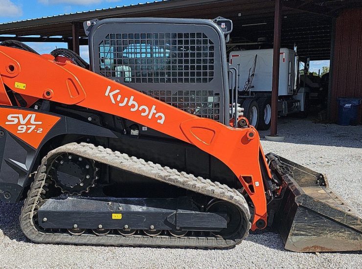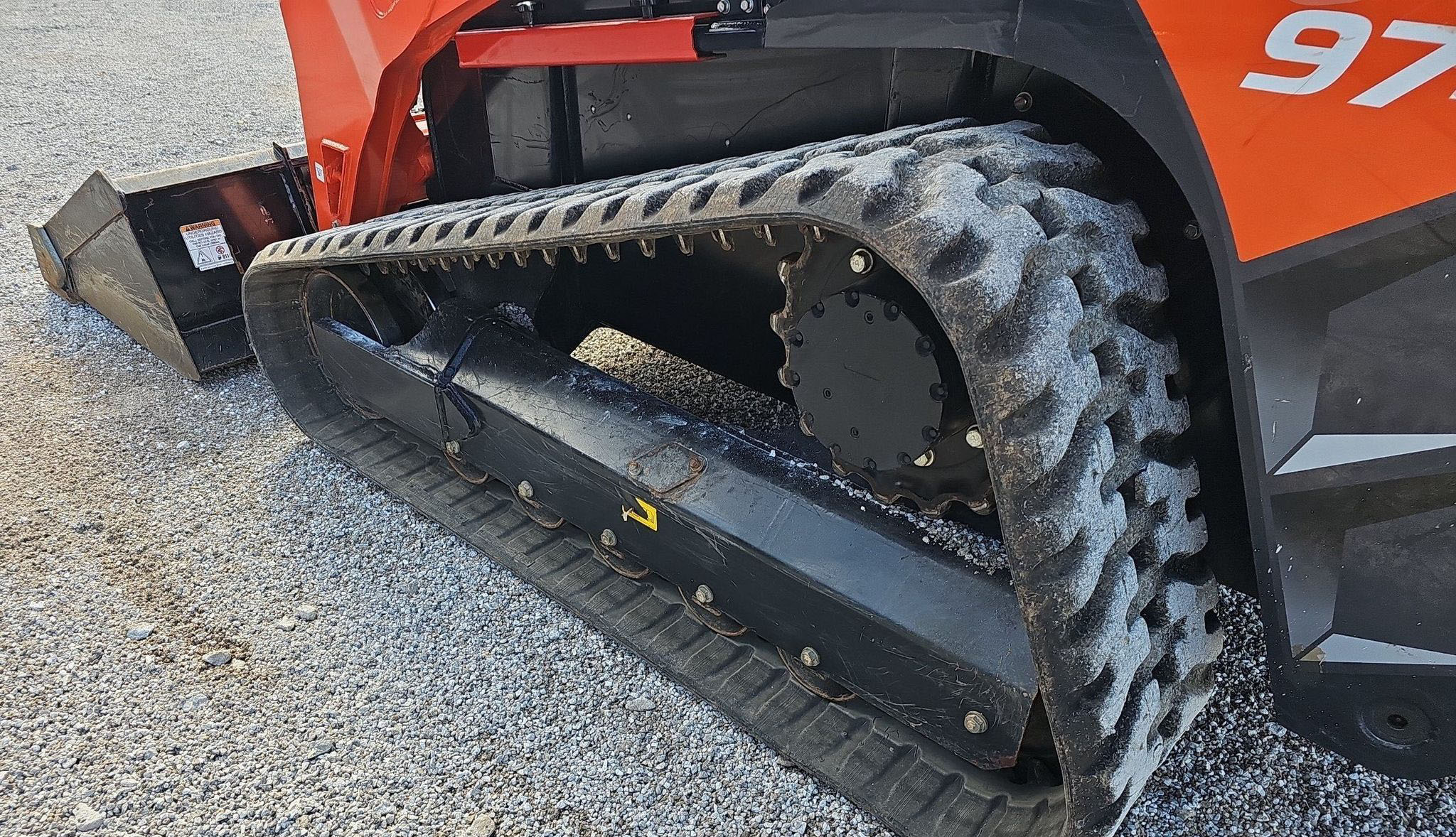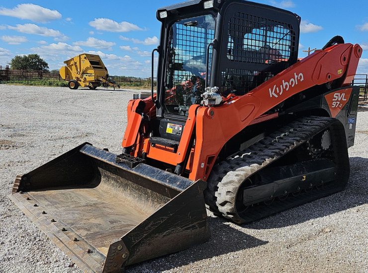The 2021 Kubota SVL97-2 skid steer loader has 204 hours and is powered by a 3.8L Kubota diesel engine with a hydrostatic transmission. It features an enclosed cab with AC and heat, and hand-controlled bucket operation. The loader includes auxiliary hydraulics with high flow, an auxiliary electrical outlet, and a hydraulic quick coupler. It has an 80" low-profile AP-HD80LLC bucket with a bolt-on cutting edge. The machine is equipped with 18" Bridgestone tracks.