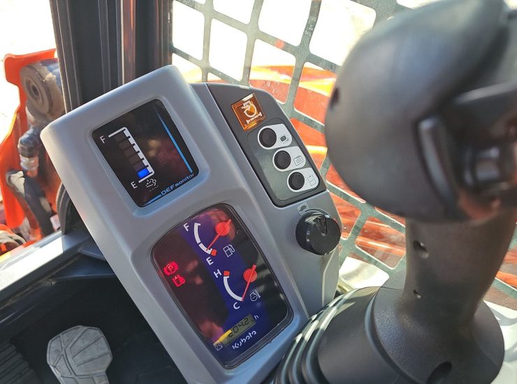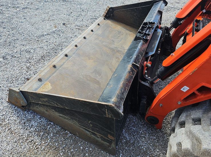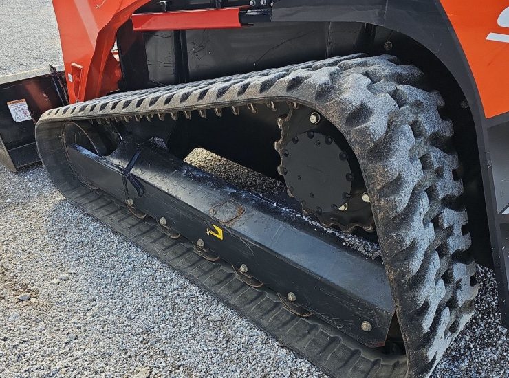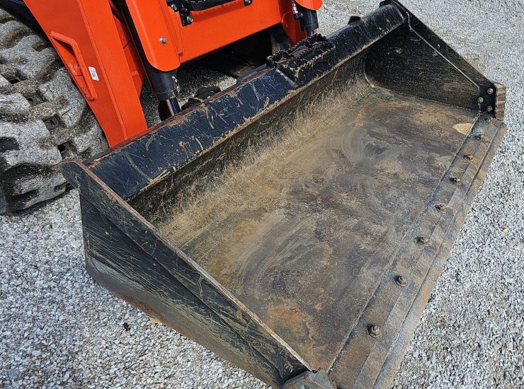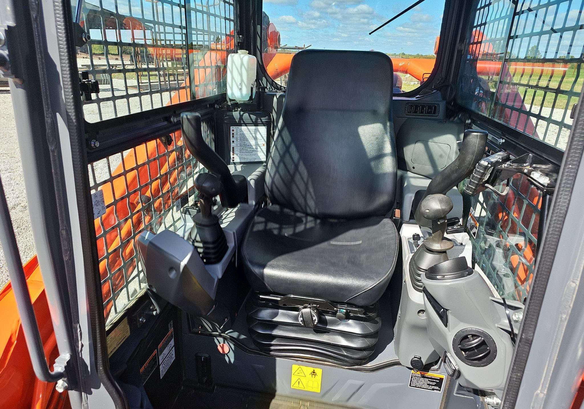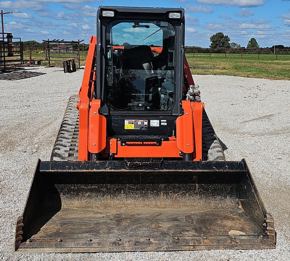 The 2021 Kubota SVL97-2 skid steer loader has 204 hours and is powered by a 3.8L Kubota diesel engine with a hydrostatic transmission. It features an enclosed cab with AC and heat, and hand-controlled bucket operation. The loader includes auxiliary hydraulics with high flow, an auxiliary electrical outlet, and a hydraulic quick coupler. It has an 80" low-profile AP-HD80LLC bucket with a bolt-on cutting edge. The machine is equipped with 18" Bridgestone tracks.